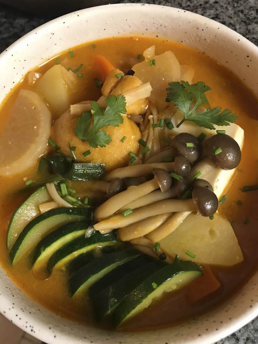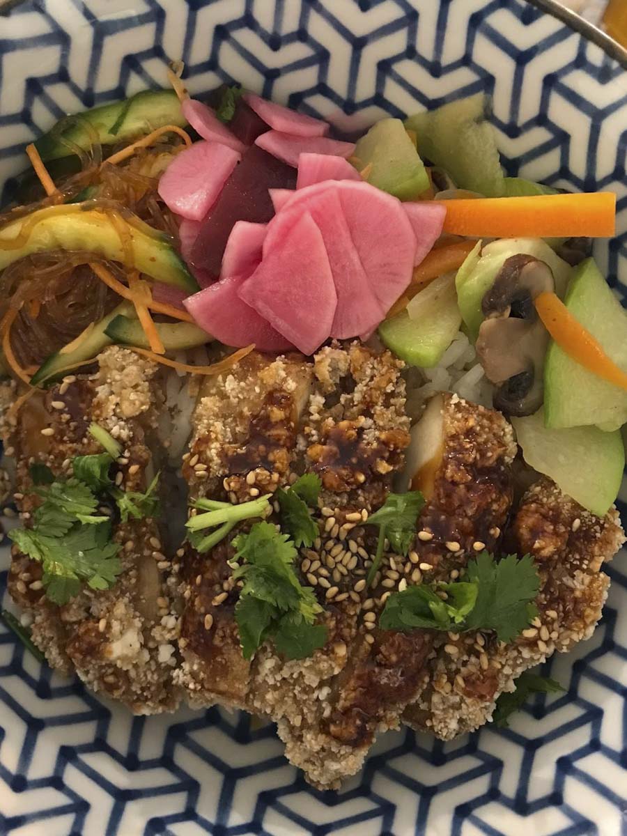 Les plats sont, servis sur un plateau en bois dont l’organisation rappelle un bento japonais : riz, légumes cuits et crus, pickles, et le plat choisi. Ce jour-là, une soupe de rouleaux de légumes et tofu, servie dans un bouillon profond et sapide réchauffe les cœurs ; et un feuilleté de tofu au ketchup taiwanais assouvit les envies décadentes. Les assaisonnements précis, les plats équilibrés, goûteux.