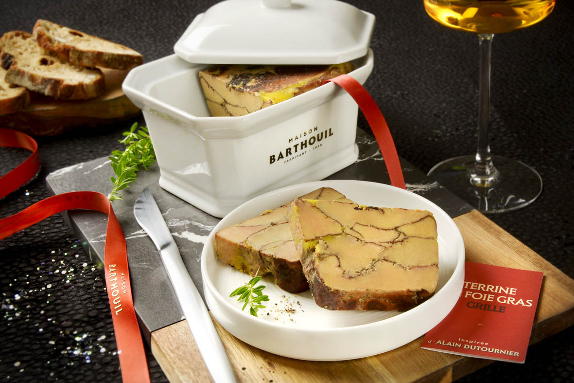 La Terrine de foie gras de canard grillé (122 € la pièce de 350 g) revisite une recette inspirée d’Alain Dutournier : lobes snackés puis cuits en terrine, elle libère des arômes intenses de fruits secs, noisettes grillées et notes fumées. Ce foie gras d’exception offre un goût affirmé et une longueur en bouche remarquable.