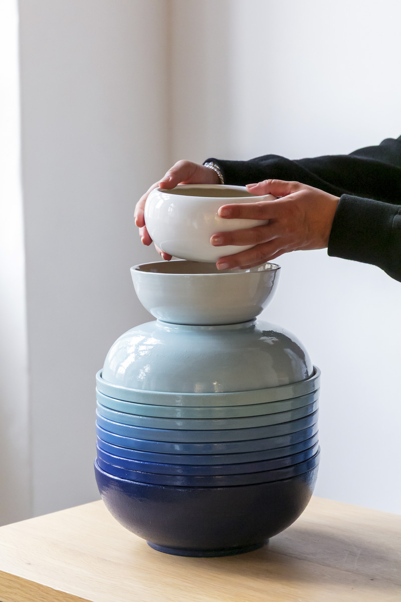 Autre style, le Totem Sea Sunrise d’Emmanuelle Musset (pièce unique en grès, 1 600 €) joue le trompe-l’œil design : un totem sculptural et coloré qui se déploie en service complet – assiettes, saladiers, bols – tous façonnés à la main. Une fois rangée, la vaisselle se transforme en œuvre d’art, parfaite pour celles et ceux qui aiment exposer autant qu’utiliser leurs pièces du quotidien.