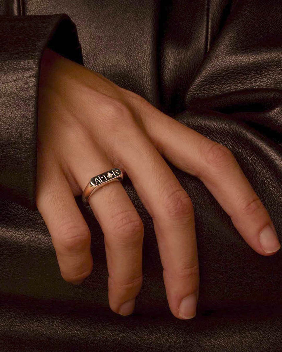 La chevalière Amor Diamant règne en best-seller absolu de la « collection argent », façonnée à la main dans l’atelier maraisien de la jeune maison de joaillerie. Son design puissant et minimaliste est gravé d’une écriture runique protectrice, où brille un solitaire. Unisexe et sculpturale, comme tous les bijoux de la marque, cette icône se réinvente avec éclat : le modèle Amor affirme son caractère unique (330 €).