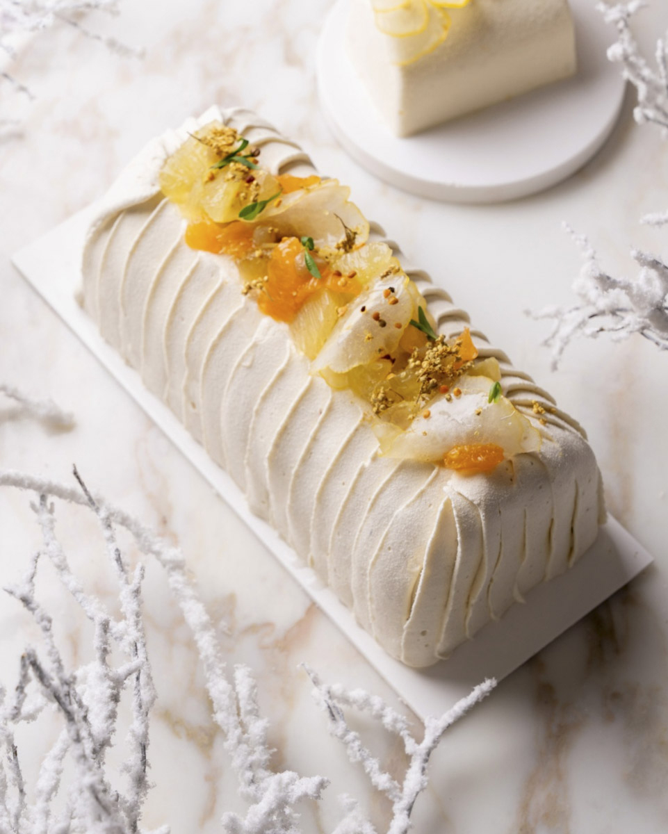 Pour Noël, la maison dévoile la bûche Herbes Folles (6/8 parts, 50 €) : une création ultra fraîche qui marie la vivacité des agrumes (crémeux citron de Menton et confit de citron pomelo), la verdeur aromatique des herbes, apporté par le biscuit, et la rondeur du yaourt grec, en mousse.