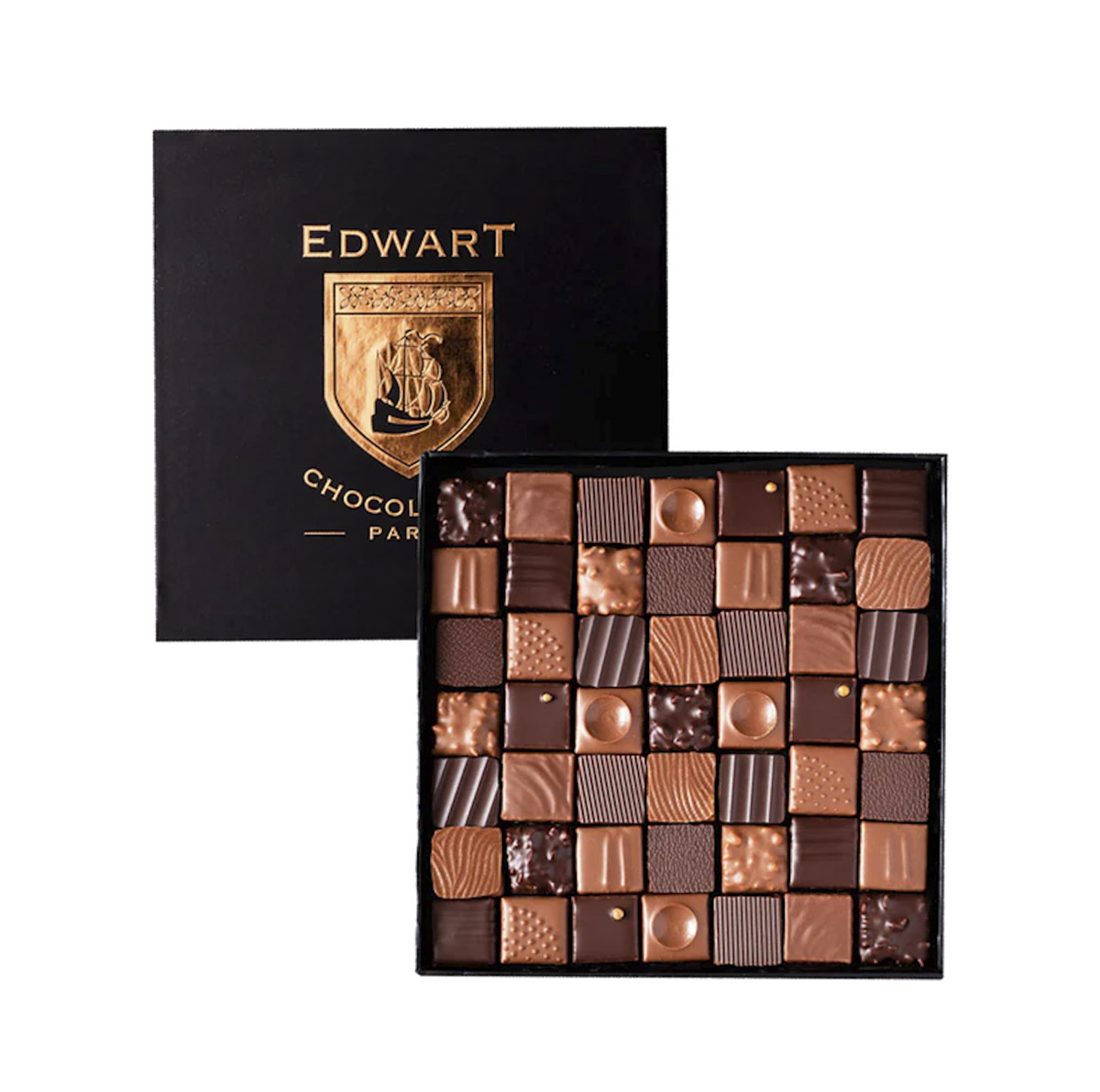 L’une des adresses fétiches des chocophiles du Marais, Edwart revendique un chocolat aussi créatif que haut de gamme, entre ganaches épicées et pralinés de caractère. La maison a commencé par le coffret de 49 pièces (46 €), qui offre un véritable défilé de saveurs, des incontournables aux créations de saison. Ainsi, Douceur Hivernale, aux saveurs litchi et framboise, ou Éclat de l’Ouest, un praliné sésame noir intense contrebalancé par une ganache au jasmin, sont pensés comme un voyage sensoriel millimétré.
